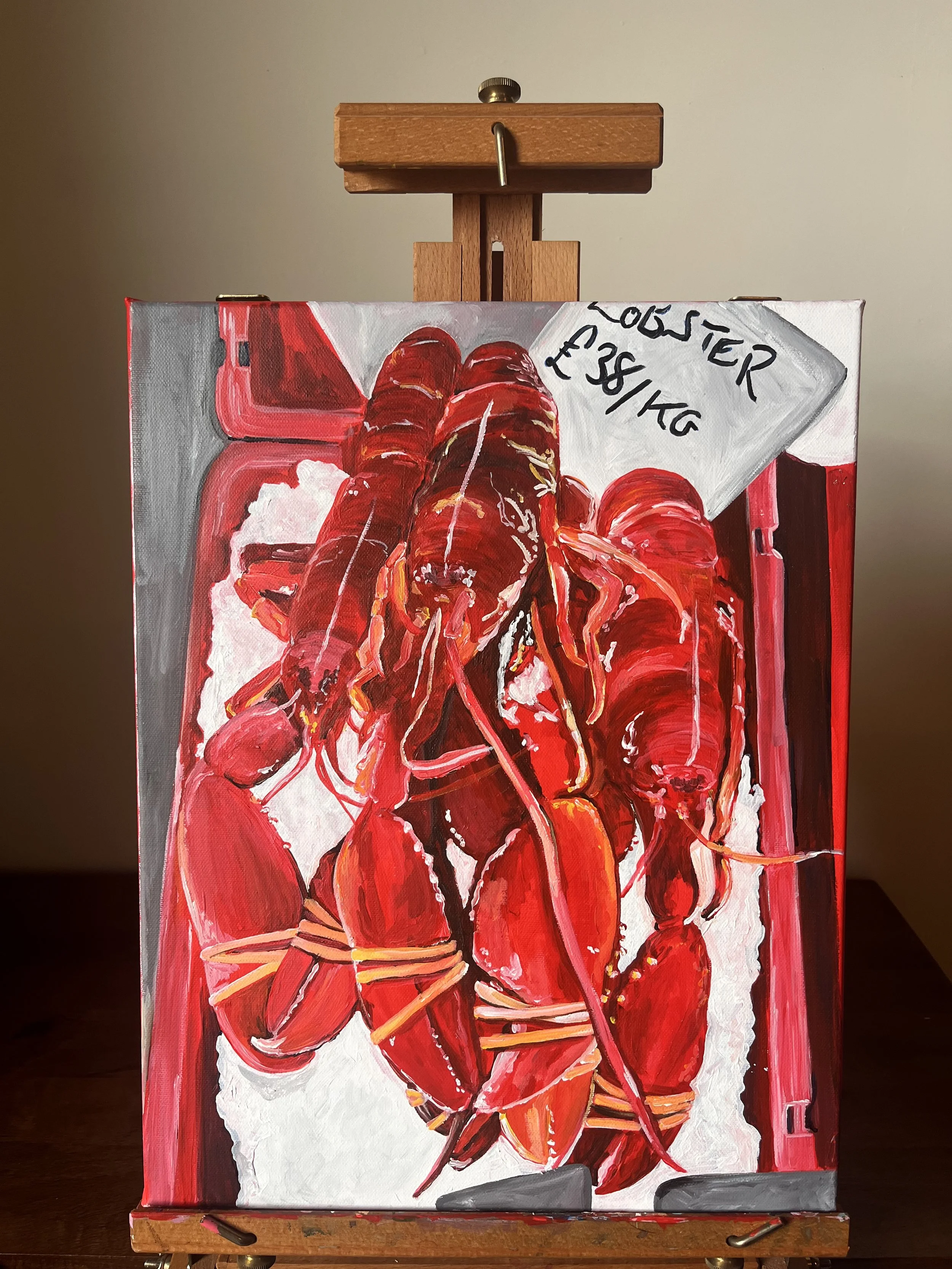Artwork which celebrates local produce, community, shared mealtimes, and the environment. My latest series is inspired by local marketplaces in Edinburgh - my new home. Going to local markets, meeting my community and supporting local makers. The marketplace is a melting pot of talent, and my art celebrates it.